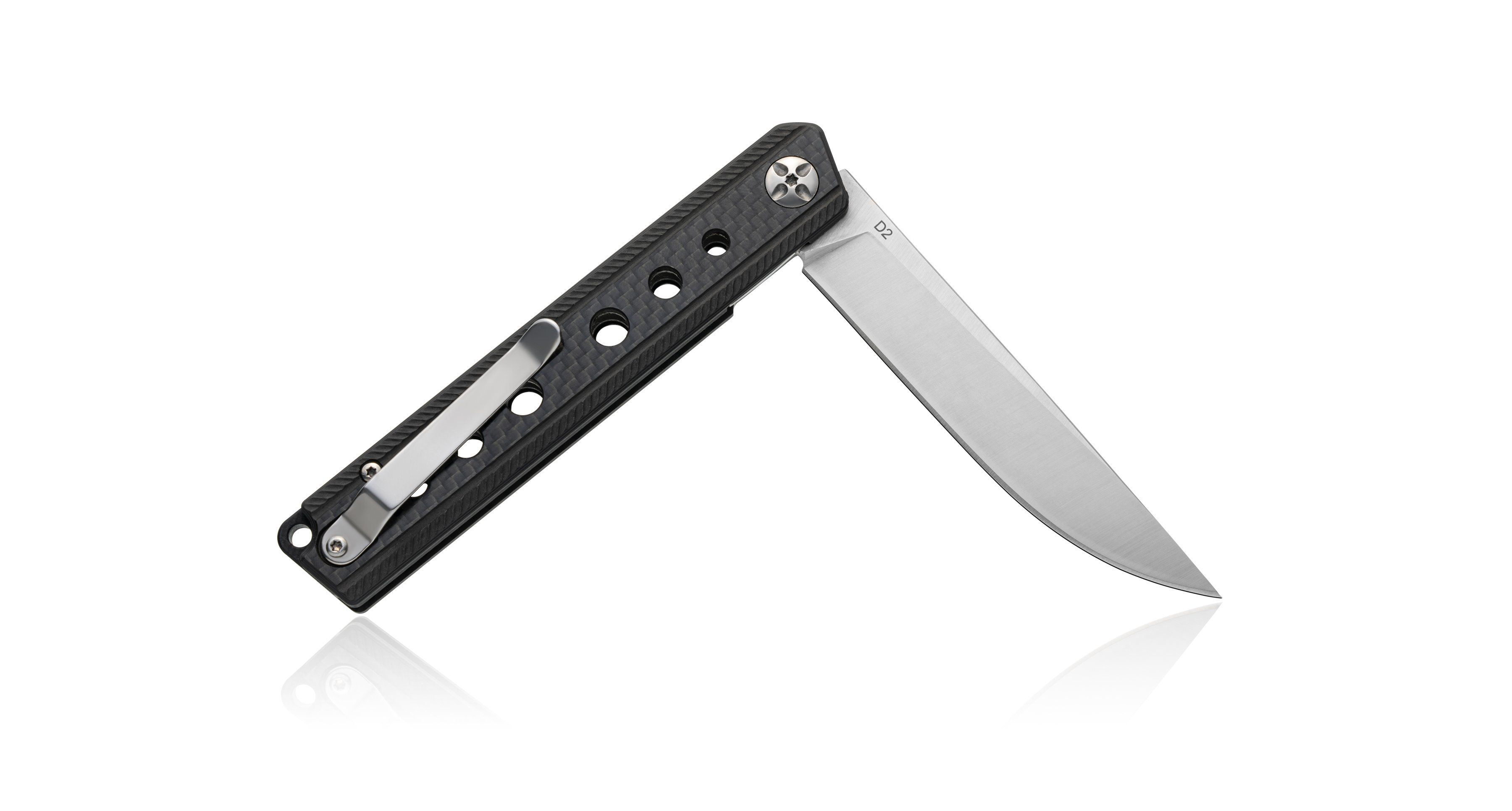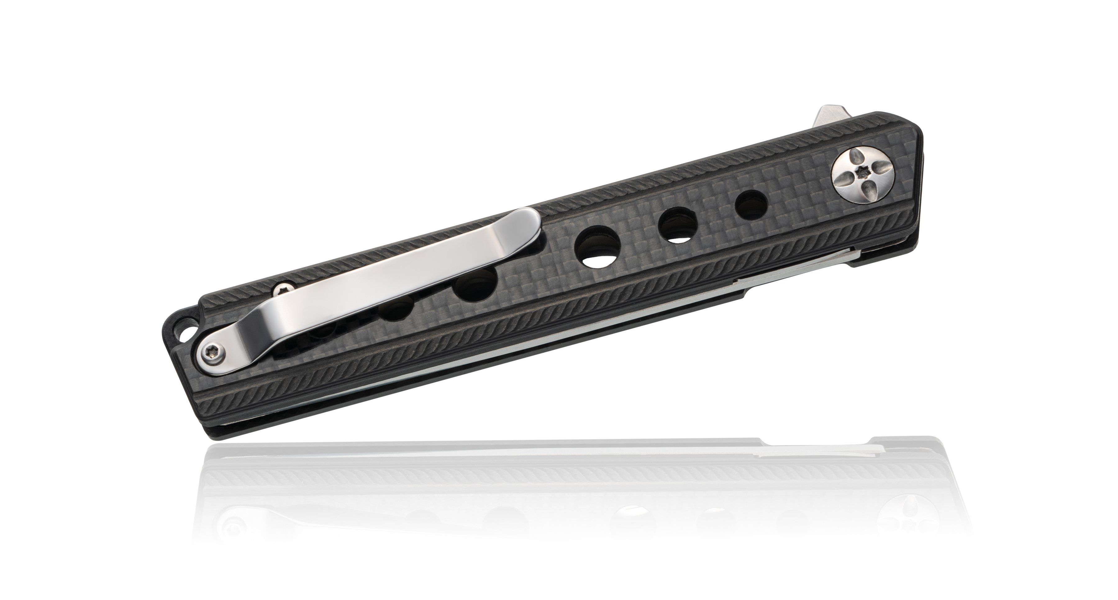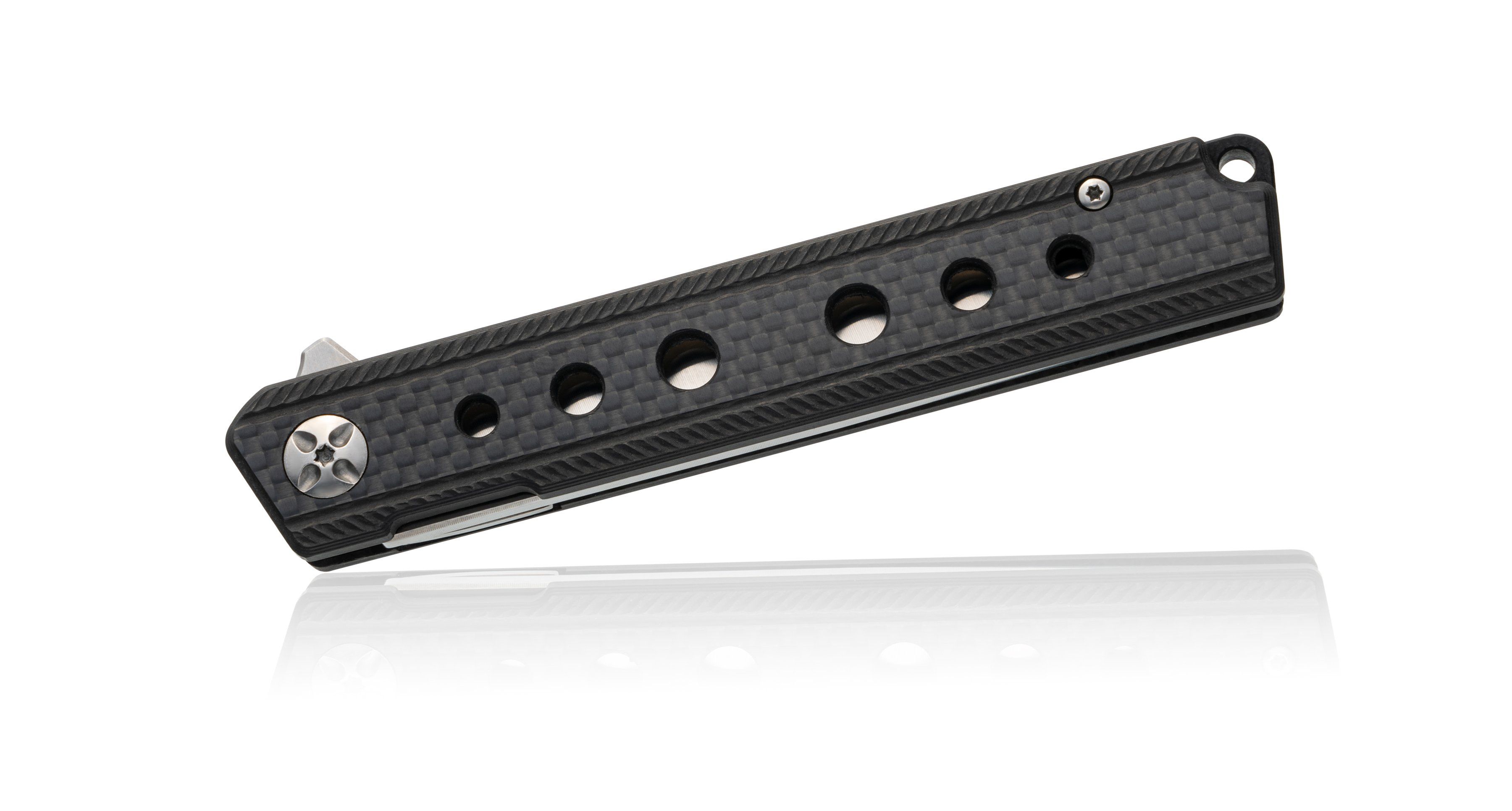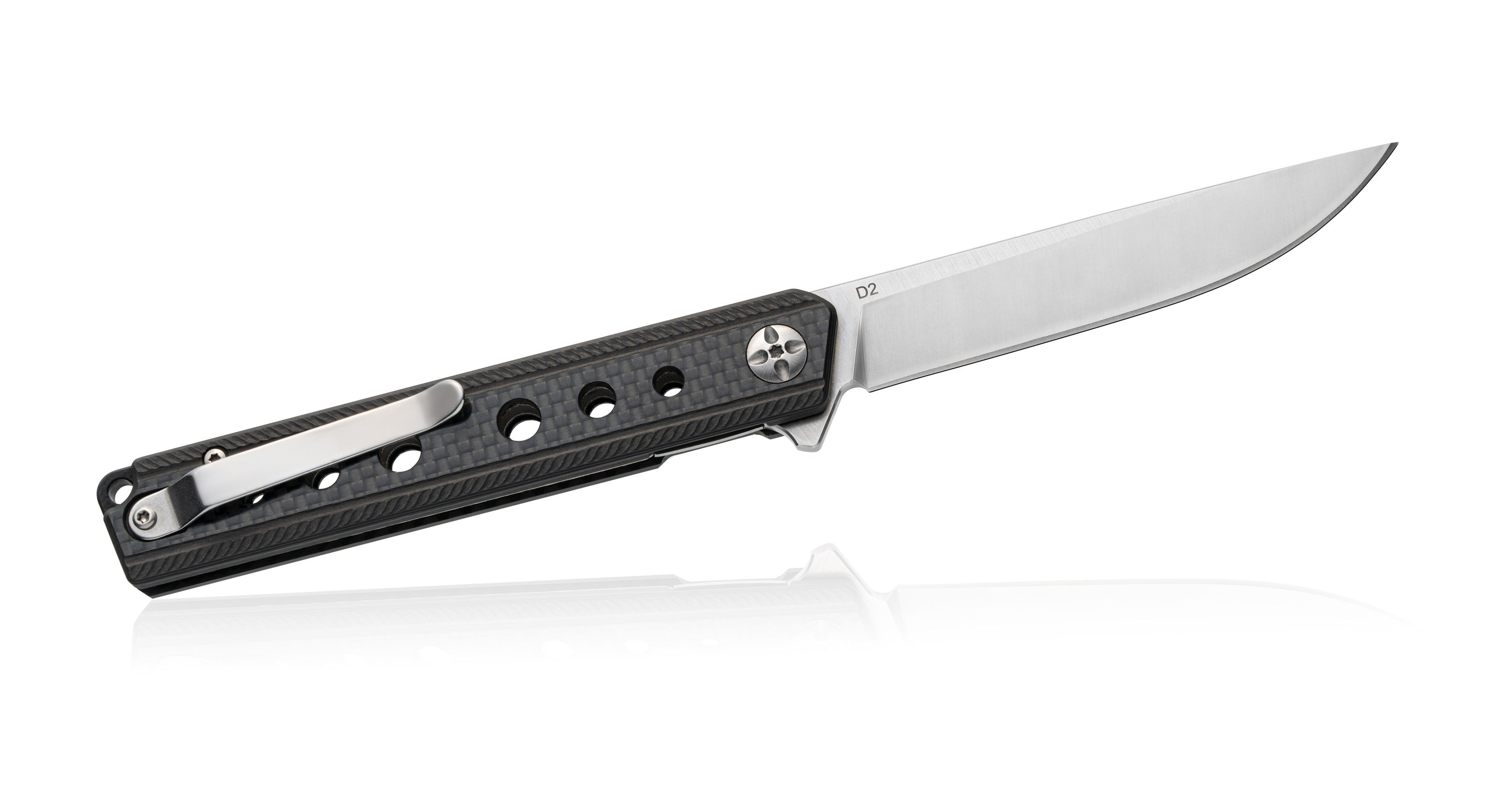 Рукоять изготовлена из углеродного волокна (carbon fiber) — ультралёгкого и прочного материала, устойчивого к влаге, ударам и перепадам температур. Стильная текстура карбона придаёт ножу современный и премиальный вид, а форма рукояти обеспечивает уверенный хват в любой ситуации.