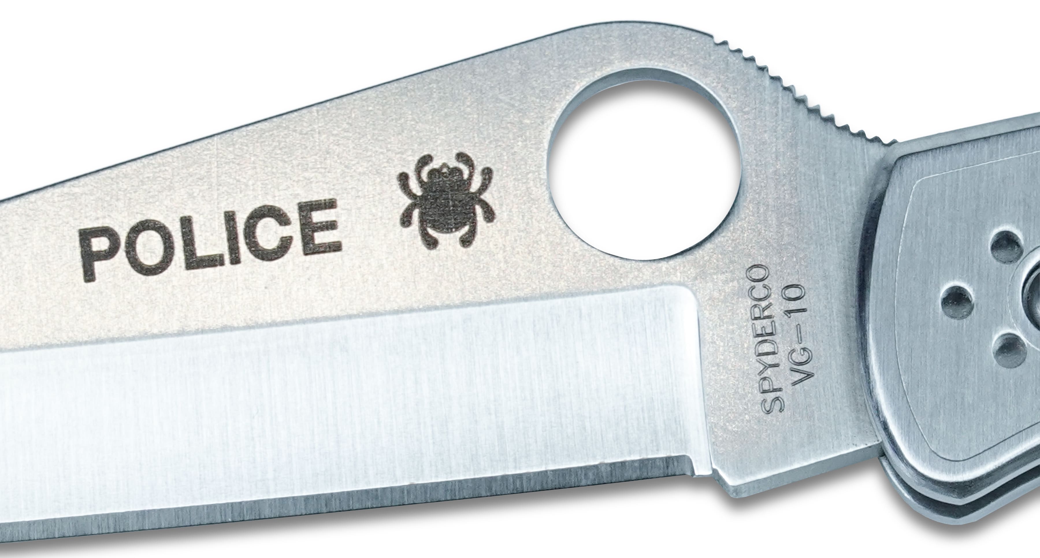 Рукоять из нержавеющей стали придаёт ножу прочность и характерный “классический” облик. Надёжный замок back lock фиксирует клинок в рабочем положении, а фирменное отверстие SpyderHole™ позволяет открывать нож одной рукой. Spyderco C07P Police ценится за минималистичный дизайн, мощный клинок и историческое значение в линейке Spyderco.
